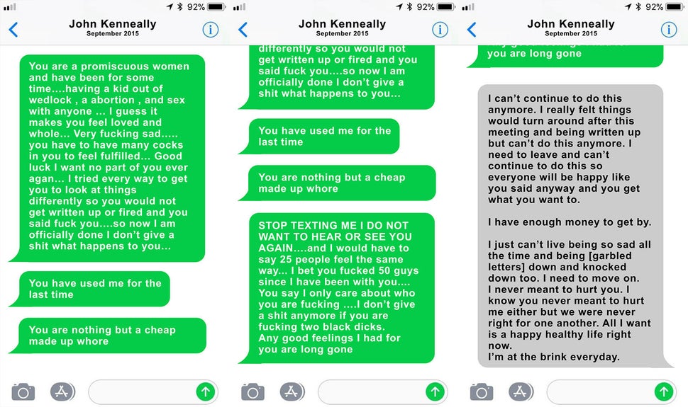 It was 2014, and Zeringue said she never could have predicted how abusive he’d become. Kenneally was a jealous lover who figured out Zeringue’s passwords so he could read her texts and emails. He privately berated her and at work displayed an explosive temper. His texts, obtained by HuffPost, were profanity-laced and filled with rage and derision.